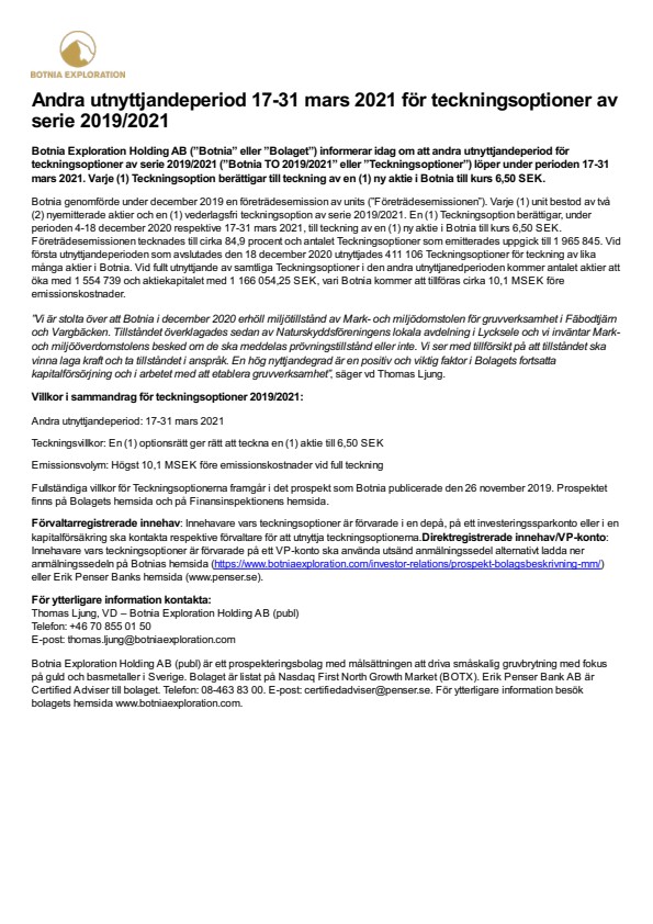 Botnia Exploration Holding AB (”Botnia” eller ”Bolaget”) informerar idag om att andra utnyttjandeperiod för teckningsoptioner av serie 2019/2021 (”Botnia TO 2019/2021” eller ”Teckningsoptioner”) löper under perioden 17-31 mars 2021. Varje (1) Teckningsoption berättigar till teckning av en (1) ny aktie i Botnia till kurs 6,50 SEK.