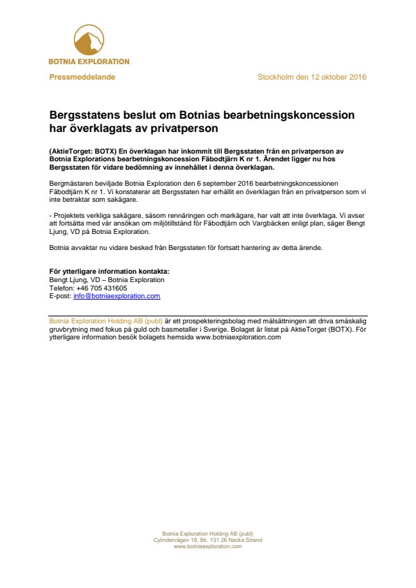 Bergmästaren beviljade Botnia Exploration den 6 september 2016 bearbetningskoncessionen Fäbodtjärn K nr 1. Vi konstaterar att Bergsstaten har erhållit en överklagan från en privatperson som vi inte betraktar som sakägare.