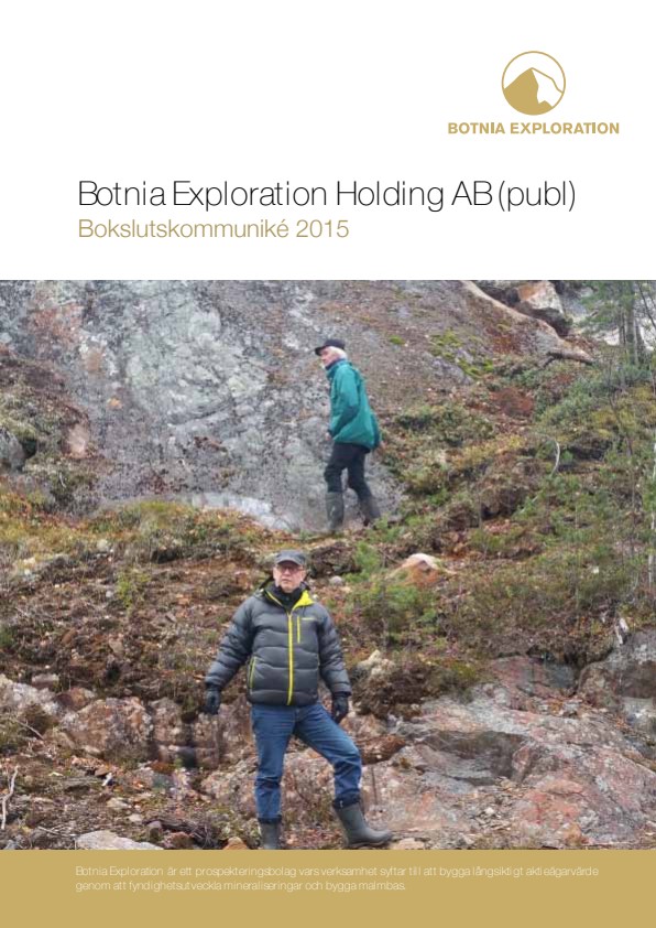 ● Botnia Exploration Holding AB säkerställde ett kapitaltillskott på 8 mkr genom en riktad emission. Emissionen skedde till teckningskursen 0,872 kronor. Emissionslikviden är avsedd att möjliggöra undersökningsborrningar under vintern 2015-2016 samt finansiera miljötillståndsarbeten för bearbetningskoncession Fäbodtjärn.