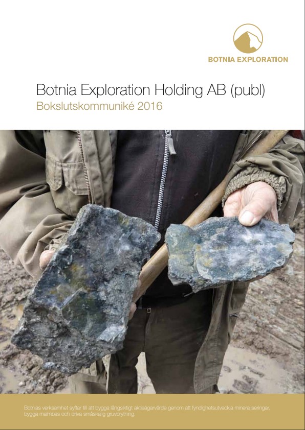 • Botnia har slutit en överenskommelse med Boliden om att i ett första skede testa 25 ton av kvartsen från Fäbodtjärn, innehållande goda halter guld, i Rönnskärsverken. Vid ett lyckosamt första test är ambitionen att utföra ett större test på cirka 8 000 ton. För att få fram denna mängd planerar Botnia att sommaren 2017 utnyttja det provbrytningstillstånd som erhölls av Länsstyrelsen 2015. Avsikten med försöken är att undersöka möjligheten om Rönnskärsverken kan använda kvartsen från Fäbodtjärn som slaggbildare i deras process. Rönnskärsverken använder idag kvartssand från bl.a. Bornholm men då kvartsen från Fäbodtjärn innehåller guld ses detta som ett intressant alternativ.