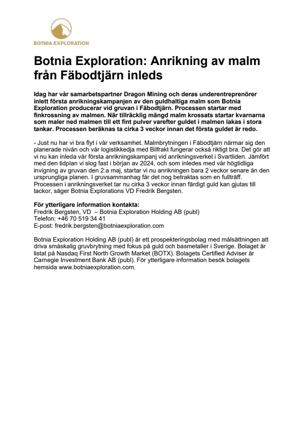 – Just nu har vi bra flyt i vår verksamhet. Malmbrytningen i Fäbodtjärn närmar sig den planerade nivån och vår logistikkedja med Bilfrakt fungerar också riktigt bra. Det gör att vi nu kan inleda vår första anrikningskampanj vid anrikningsverket i Svartliden. Jämfört med den tidplan vi slog fast i början av 2024, och som inledes med vår högtidliga invigning av gruvan den 2:a maj, startar vi nu anrikningen bara 2 veckor senare än den ursprungliga planen. I gruvsammanhag får det nog betraktas som en fullträff. Processen i anrikningsverket tar nu cirka 3 veckor innan färdigt guld kan gjutas till tackor, säger Botnia Explorations VD Fredrik Bergsten.