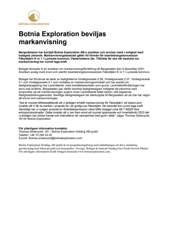 ”Det är mycket tillfredsställande att vi äntligen erhållit markanvisning för Fäbodtjärn, ett beslut som innebär att vi får ta marken i anspråk för vår guldgruva Fäbodtjärn när beslutet har vunnit laga kraft. Samtidigt har vi nyligen avslutat en företrädesemission vilket tillför bolaget cirka 68,7 MSEK före emissionskostnader. Detta innebär att vi ser fram emot ett mycket spännande och innehållsrikt 2023 där vi äntligen kan blicka framåt och intensifiera vår verksamhet med guld i sikte”, säger Thomas Söderqvist, VD för Botnia Exploration.