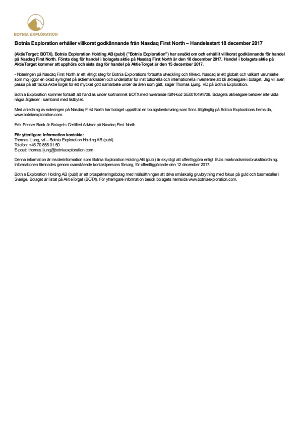 – Noteringen på Nasdaq First North är ett viktigt steg för Botnia Explorations fortsatta utveckling och tillväxt. Nasdaq är ett globalt och välkänt varumärke som möjliggör en ökad synlighet på aktiemarknaden och underlättar för institutionella och internationella investerare att bli aktieägare i bolaget. Jag vill även passa på att tacka AktieTorget för ett mycket gott samarbete under de åren som gått, säger Thomas Ljung, VD på Botnia Exploration.
