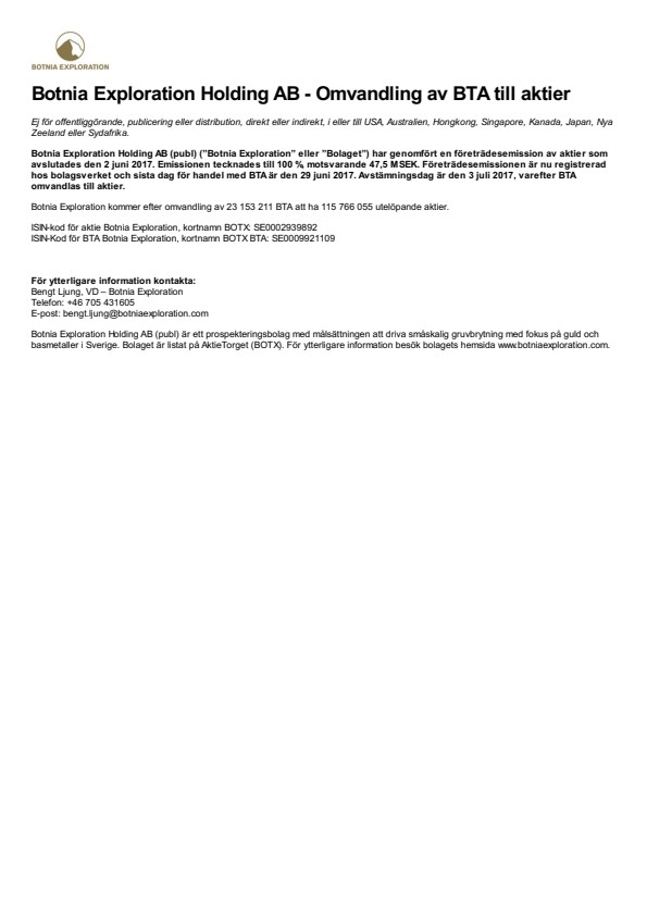 Botnia Exploration Holding AB (publ) (”Botnia Exploration” eller ”Bolaget”) har genomfört en företrädesemission av aktier som avslutades den 2 juni 2017. Emissionen tecknades till 100 %, motsvarande 47,5 MSEK. Företrädesemissionen är nu registrerad hos bolagsverket och sista dag för handel med BTA är den 29 juni 2017. Avstämningsdag är den 3 juli 2017, varefter BTA omvandlas till aktier.