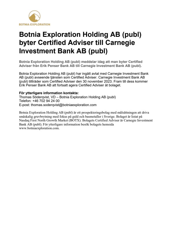 Botnia Exploration Holding AB (publ) har ingått avtal med Carnegie Investment Bank AB (publ) avseende tjänsten som Certified Adviser. Carnegie Investment Bank AB (publ) tillträder som Certified Adviser den 30 november 2023. Fram till dess kommer Erik Penser Bank AB att fortsatt agera Certified Adviser åt bolaget.
