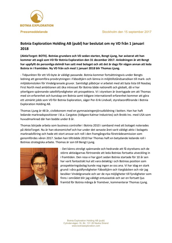 – Tidpunkten för ett VD-byte är väldigt passande. Botnia kommer fortsättningsvis under Bengts ledning att genomföra provbrytningen i Fäbodtjärn och lämna in miljötillståndsansökan till mark- och miljödomstolen för Vindelgransele gruvor. Samtidigt påbörjar vi arbetet med att byta lista till Nasdaq First North med ambitionen att öka intresset för Botnia både nationellt och globalt, då vi har ytterligare spännande satellitfyndigheter att prospektera. Vi i styrelsen är övertygade om att Thomas med sin erfarenhet och kunskap om Botnia samt tidigare internationell erfarenhet kommer att göra ett utmärkt jobb som VD för Botnia Exploration, säger Per-Erik Lindvall, styrelseordförande i Botnia Exploration Holding AB.