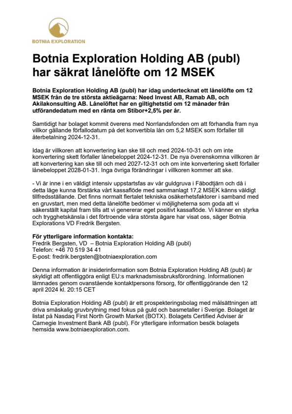 – Vi är inne i en väldigt intensiv uppstartsfas av vår guldgruva i Fäbodtjärn och då i detta läge kunna förstärka vårt kassaflöde med sammanlagt 17,2 MSEK känns väldigt tillfredsställande. Det finns normalt flertalet tekniska osäkerhetsfaktorer i samband med en gruvstart, men med detta lånelöfte bedömer vi möjligheterna som goda att vi säkerställt kapital fram tills att vi genererar eget positivt kassaflöde. Vi känner en styrka och trygghetskänsla i det förtroende våra största ägare har visat oss, säger Botnia Explorations VD Fredrik Bergsten.