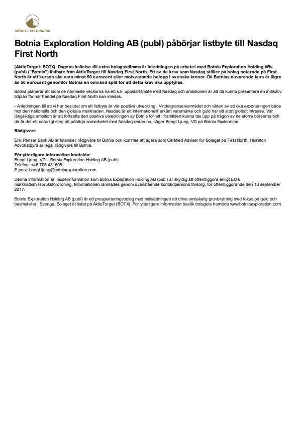 – Anledningen till att vi har beslutat om ett listbyte är vår positiva utveckling i Vindelgranseleområdet och vikten av att öka exponeringen både mot den nationella och den globala marknaden. Nasdaq är ett internationellt erkänt varumärke och guld har ett stort globalt intresse. Vår långsiktiga ambition är att fortsätta den positiva utvecklingen av Botnia för att i framtiden kunna tas upp på någon av de större börserna och då är det ett naturligt steg att påbörja samarbetet med Nasdaq redan nu, säger Bengt Ljung, VD på Botnia Exploration.