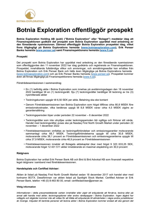 Det prospekt som Botnia Exploration har upprättat med anledning av den förestående nyemissionen som offentliggjordes den 11 november 2022 har idag godkänts och registrerats av Finansinspektionen. Prospektet, innehållande fullständiga villkor och anvisningar, och anmälningssedlar kan erhållas från Botnia Exploration och Erik Penser Bank och hålls även tillgängliga på Botnia Explorations hemsida (www.botniaexploration.com) och på Erik Penser Banks hemsida (www.penser.se). Prospektet kommer även att finnas tillgängligt på Finansinspektionens hemsida (www.fi.se).
