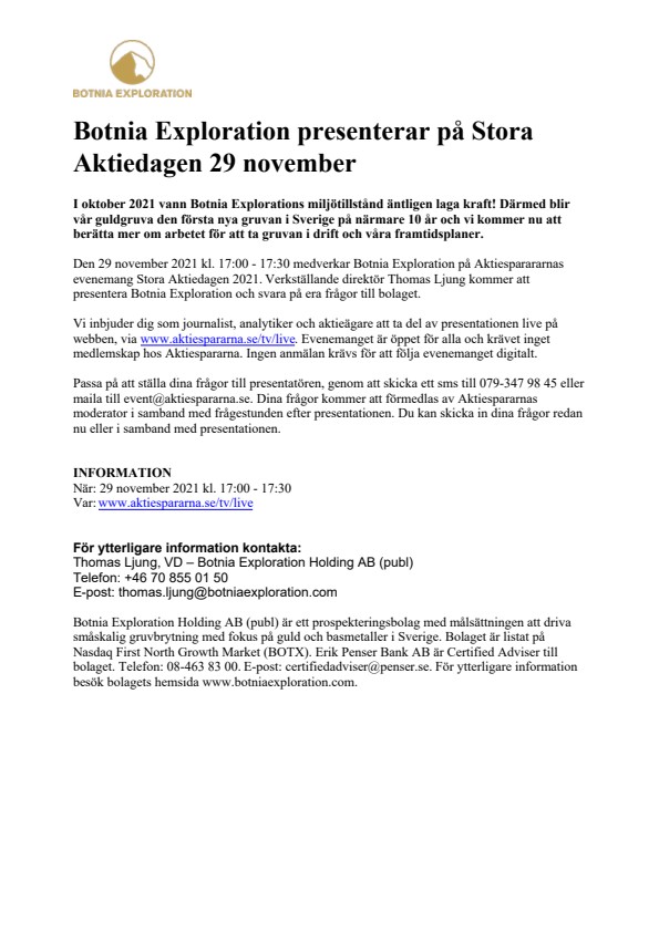 Den 29 november 2021 kl. 17:00 – 17:30 medverkar Botnia Exploration på Aktiesparararnas evenemang Stora Aktiedagen 2021. Verkställande direktör Thomas Ljung kommer att presentera Botnia Exploration och svara på era frågor till bolaget.