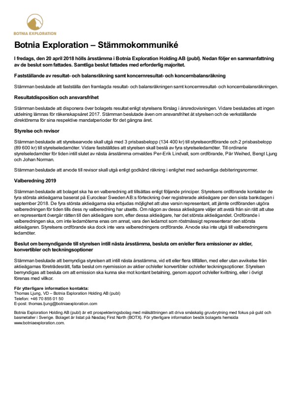Stämman beslutade att bolaget ska ha en valberedning att tillsättas enligt följande principer. Styrelsens ordförande kontakter de fyra största aktieägarna baserat på Euroclear Sweden AB:s förteckning över registrerade aktieägare per den sista bankdagen i september 2018. De fyra största aktieägarna ska erbjudas möjlighet att utse varsin representant, att jämte ordföranden utgöra valberedningen för tiden tills dess ny valberedning har utsetts. Om någon av dessa aktieägare väljer att avstå från sin rätt att utse en representant övergår rätten till den aktieägare som, efter dessa aktieägare, har det största aktieägandet. Ordförande i valberedningen ska, om inte ledamöterna enas om annat, vara den ledamot som röstmässigt representerar den största aktieägaren. Styrelsens ordförande ska dock inte vara valberedningens ordförande. Arvode ska inte utgå till valberedningens ledamöter.