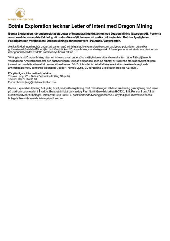 Botnia Exploration har undertecknat ett Letter of Intent (avsiktsförklaring) med Dragon Mining (Sweden) AB. Parterna avser med denna avsiktsförklaring att undersöka möjligheterna att anrika guldmalm från Botnias fyndigheter Fäbodtjärn och Vargbäcken i Dragon Minings anrikningsverk i Pauträsk, Västerbotten.