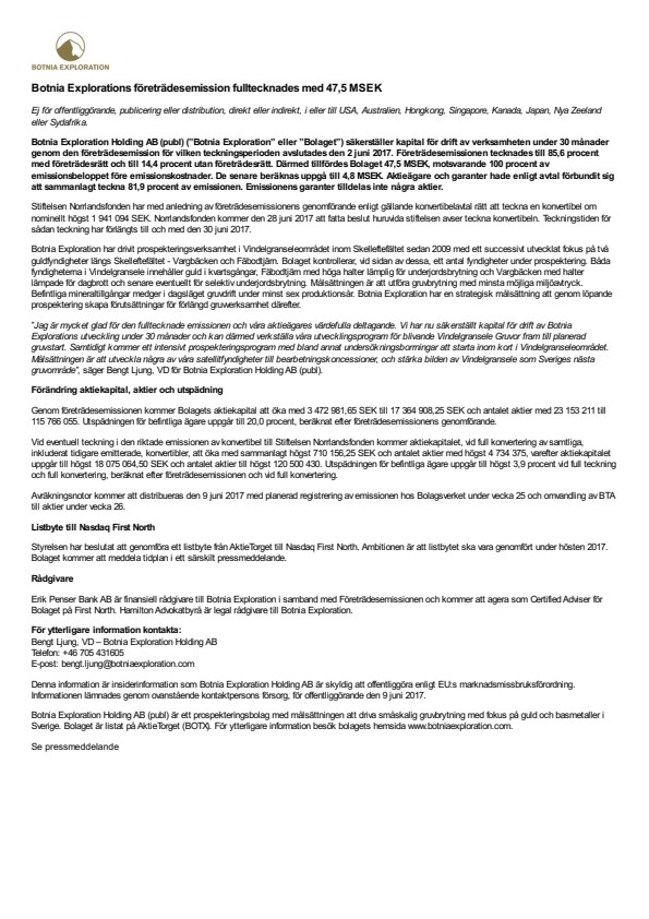 Botnia Exploration Holding AB (publ) (”Botnia Exploration” eller ”Bolaget”) säkerställer kapital för drift av verksamheten under 30 månader genom den företrädesemission för vilken teckningsperioden avslutades den 2 juni 2017. Företrädesemissionen tecknades till 85,6 procent med företrädesrätt och till 14,4 procent utan företrädesrätt. Därmed tillfördes Bolaget 47,5 MSEK, motsvarande 100 procent av emissionsbeloppet före emissionskostnader. De senare beräknas uppgå till 4,8 MSEK. Aktieägare och garanter hade enligt avtal förbundit sig att sammanlagt teckna 81,9 procent av emissionen. Emissionens garanter tilldelas inte några aktier.