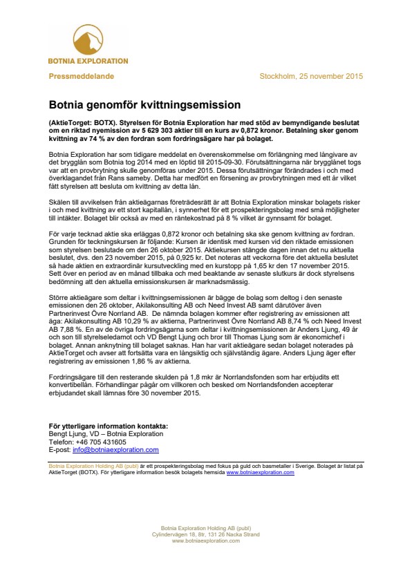 (AktieTorget: BOTX). Styrelsen för Botnia Exploration har med stöd av bemyndigande beslutat om en riktad nyemission av 5 629 303 aktier till en kurs av 0,872 kronor. Betalning sker genom kvittning av 74 % av den fordran som fordringsägare har på bolaget.