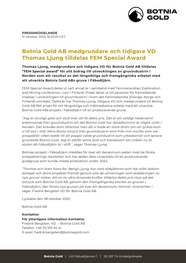 Thomas Ljung, medgrundare och tidigare VD för Botnia Gold AB tilldelas ”FEM Special award” för sitt bidrag till utvecklingen av gruvindustrin i Norden som ett resultat av det långsiktiga och framgångriska arbetet med att utveckla Botnia Gold ABs gruva i Fäbodtjärn.