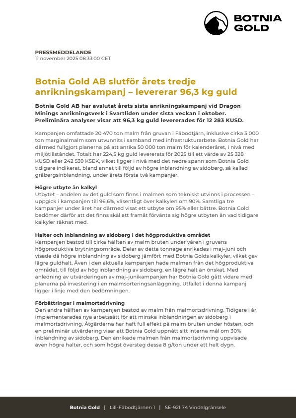Botnia Gold AB har avslutat årets sista anrikningskampanj vid Dragon Minings anrikningsverk i Svartliden under sista veckan i oktober. Preliminära analyser visar att 96,3 kg guld levererades för 12 283 KUSD.