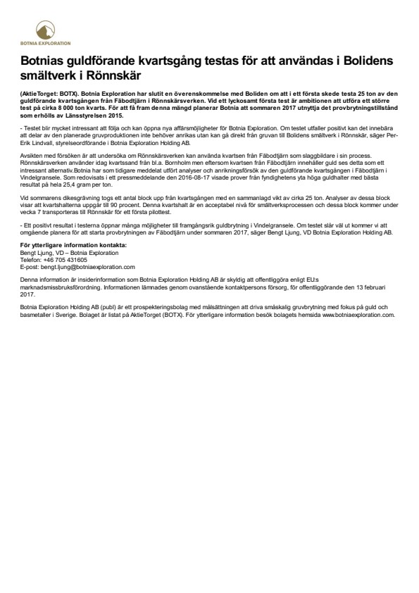 Avsikten med försöken är att undersöka om Rönnskärsverken kan använda kvartsen från Fäbodtjärn som slaggbildare i sin process. Rönnskärsverken använder idag kvartssand från bl.a. Bornholm men eftersom kvartsen från Fäbodtjärn innehåller guld ses detta som ett intressant alternativ.Botnia har som tidigare meddelat utfört analyser och anrikningsförsök av den guldförande kvartsgången i Fäbodtjärn i Vindelgransele. Som redovisats i ett pressmeddelande den 2016-08-17 visade prover från fyndighetens yta höga guldhalter med bästa resultat på hela 25,4 gram per ton.