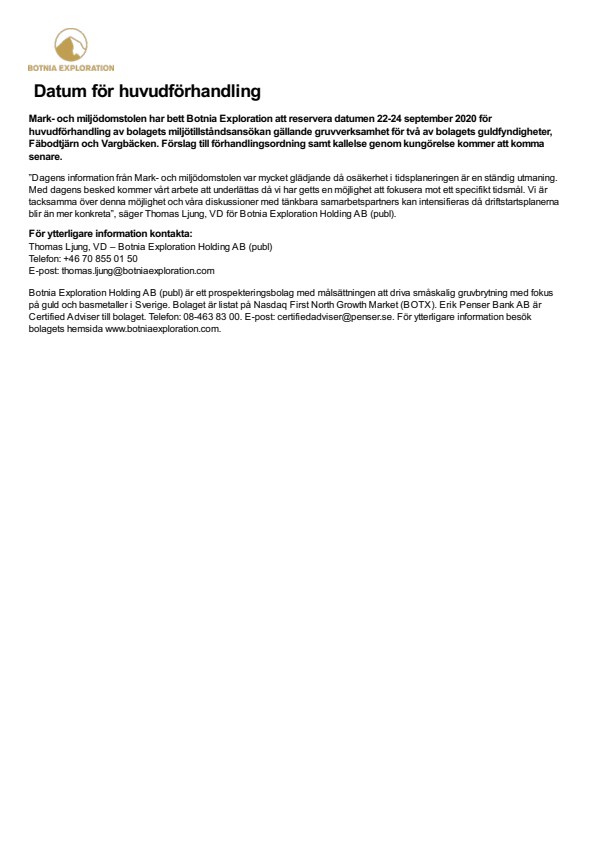 Mark- och miljödomstolen har bett Botnia Exploration att reservera datumen 22-24 september 2020 för huvudförhandling av bolagets miljötillståndsansökan gällande gruvverksamhet för två av bolagets guldfyndigheter, Fäbodtjärn och Vargbäcken. Förslag till förhandlingsordning samt kallelse genom kungörelse kommer att komma senare.