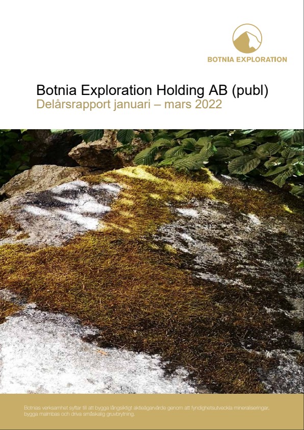 - Bearbetningskoncession Fäbodtjärn K nr 1 är giltig till och med 2041-09-06. Fäbodtjärn är en höghaltig guldfyndighet med goda möjligheter att utvecklas till en lönsam gruva samtidigt som fyndigheten inte är avgränsad mot djupet. Feasibilitystudien av Fäbodtjärn har stärkt vår bedömning att Fäbodtjärn kommer bli en lönsam guldfyndighet. Guldhalterna är bekräftat höga även i kvartsgångens översta nivåer, vilket bör kunna leda till ett positivt kassaflöde i ett tidigt skede av gruvans livslängd. Guldpriset den 4 maj 2022, cirka 595 kSEK/kg, har förbättrat den lönsamhetskalkyl som presenterades i pressmeddelande den 7 juni 2018 då guldpriset var 364 kSEK/kg. Botnia Exploration bedömer att mineraliseringen har potential att fortsätta mot djupet vilket kan leda till ökad livslängd för gruvdriften i Fäbodtjärn.