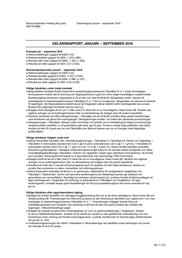 - Bolaget har erhållit lånelöften om ytterligare bryggfinansiering från två av de större aktieägarna, Need Invest AB och Akilakonsulting AB. Finansieringen har tillkommit på grund av den försening av aktiviteter som uppkommit i och med överklagan av bearbetningskoncession Fäbodtjärn K nr 1. Finansieringen möjliggör fortsatt fokus på miljötillståndsarbetet som fortsätter med oavbruten kraft fram till dess att positivt besked kan erhållas från regeringen. Villkorsförhandlingar pågår.