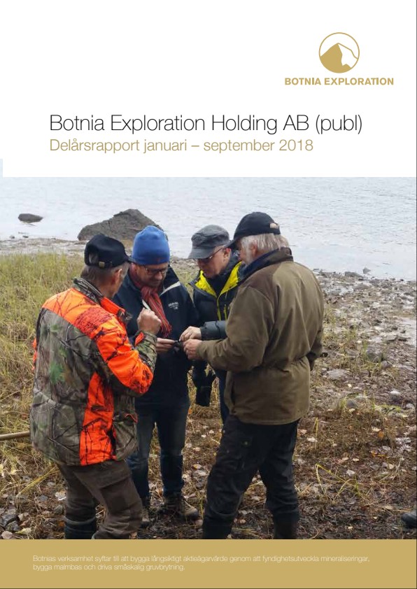 • Botnia Exploration redovisade i pressmeddelande den 22 oktober resultaten från det kärnborrprogram som genomfördes vintern/våren 2017–2018. Kärnborrprogrammet omfattade 2 214 borrmetrar fördelade över femton borrhål i Vindelgranseleområdet. Programmet utfördes i målområden Fäbodliden A och Fäbodliden B samt i Middagsberget Norra. I Fäbodliden A kan vi nu bekräfta att det finns en väl definierad guldförande zon i diorit över minimalt 200–250 m i längdriktningen och 100–125 m i djupled. Botnia Exploration planerar nu att undersöka förutsättningarna för att gå vidare med en ansökan om bearbetningskoncession i Fäbodliden A.