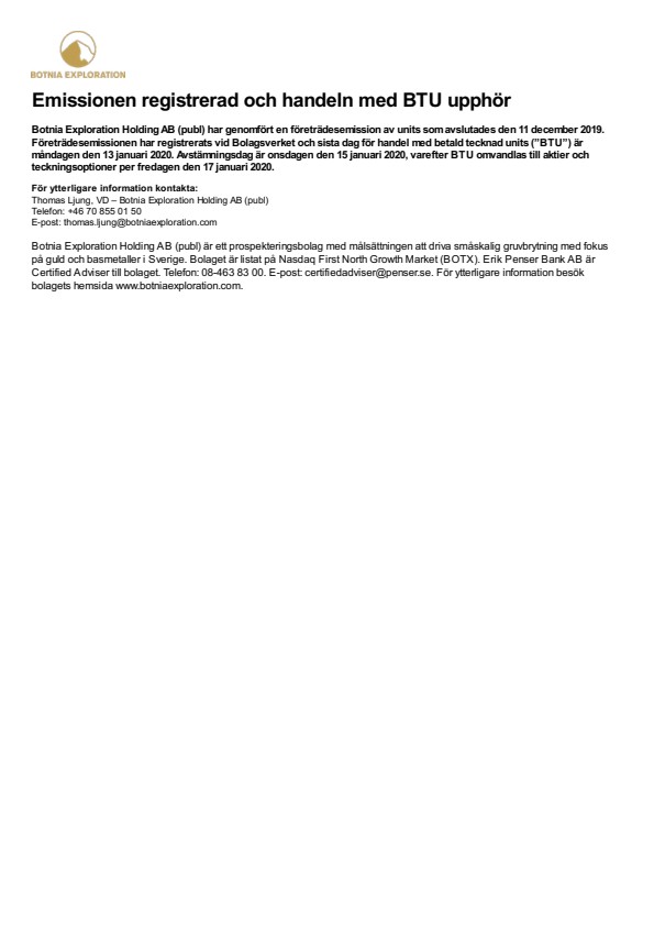 Botnia Exploration Holding AB (publ) har genomfört en företrädesemission av units som avslutades den 11 december 2019. Företrädesemissionen har registrerats vid Bolagsverket och sista dag för handel med betald tecknad units (”BTU”) är måndagen den 13 januari 2020. Avstämningsdag är onsdagen den 15 januari 2020, varefter BTU omvandlas till aktier och teckningsoptioner per fredagen den 17 januari 2020.