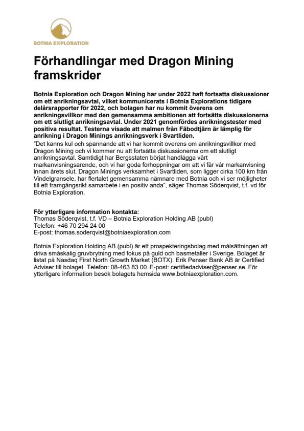 Botnia Exploration och Dragon Mining har under 2022 haft fortsatta diskussioner om ett anrikningsavtal, vilket kommunicerats i Botnia Explorations tidigare delårsrapporter för 2022, och bolagen har nu kommit överens om anrikningsvillkor med den gemensamma ambitionen att fortsätta diskussionerna om ett slutligt anrikningsavtal. Under 2021 genomfördes anrikningstester med positiva resultat. Testerna visade att malmen från Fäbodtjärn är lämplig för anrikning i Dragon Minings anrikningsverk i Svartliden.