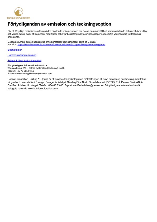 Dessa dokument och en uppdaterad emissionsfolder framgår bifogat samt på Botnias hemsida, https://www.botniaexploration.com/investor-relations/prospekt-bolagsbeskrivning-mm/