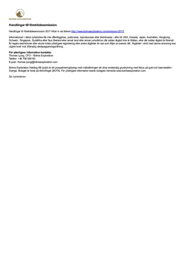 Handlingar till företrädesemission 2017 hittar ni via länken http://www.botniaexploration.com/emission-2017/