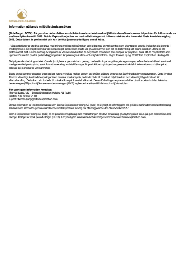 (AktieTorget: BOTX). På grund av det omfattande och tidskrävande arbetet med miljötillståndsansökan kommer tidpunkten för inlämnande av ansökan flyttas fram till 2018. Botnia Exploration jobbar nu med målsättningen att inlämnandet ska ske innan det första kvartalets utgång 2018. Detta datum är preliminärt och kan behöva justeras ytterligare om så krävs.