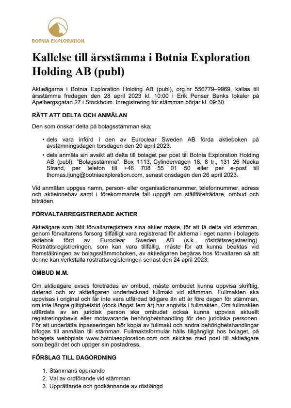 Aktieägarna i Botnia Exploration Holding AB (publ), org.nr 556779–9969, kallas till årsstämma fredagen den 28 april 2023 kl. 10:00 i Erik Penser Banks lokaler på Apelbergsgatan 27 i Stockholm. Inregistrering för stämman börjar kl. 09:30.
