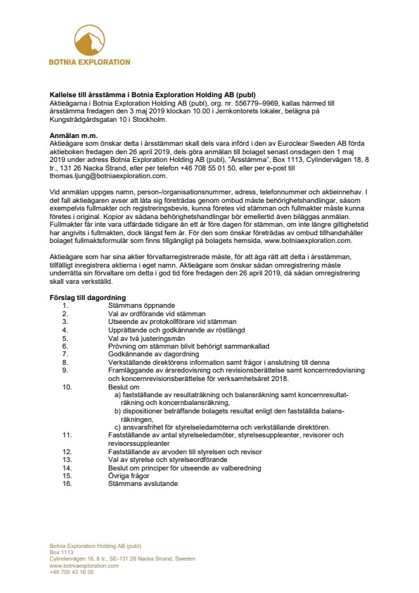 Aktieägarna i Botnia Exploration Holding AB (publ), org. nr. 556779–9969, kallas härmed till årsstämma fredagen den 3 maj 2019 klockan 10.00 i Jernkontorets lokaler, belägna på Kungsträdgårdsgatan 10 i Stockholm.