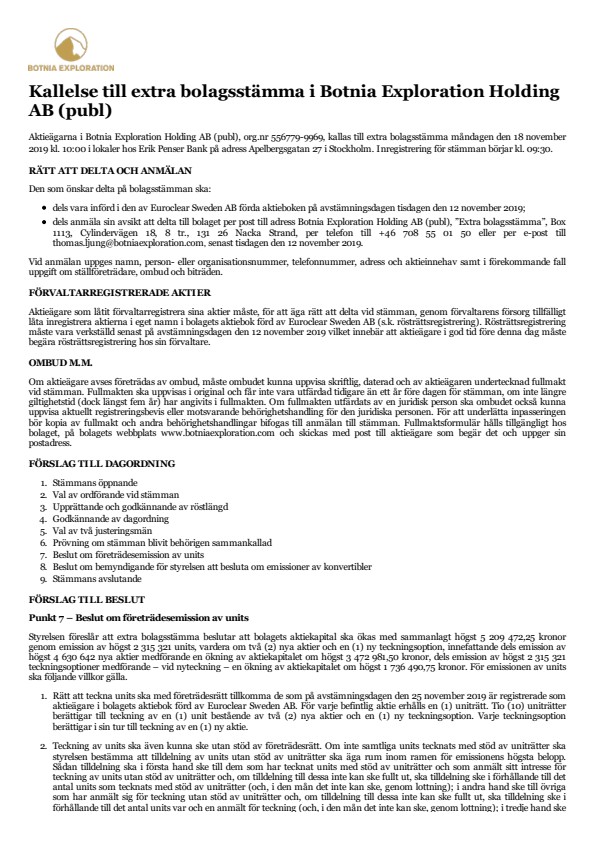 - dels anmäla sin avsikt att delta till bolaget per post till adress Botnia Exploration Holding AB (publ), ”Extra bolagsstämma”, Box 1113, Cylindervägen 18, 8 tr., 131 26 Nacka Strand, per telefon till +46 708 55 01 50 eller per e-post till thomas.ljung@botniaexploration.com, senast tisdagen den 12 november 2019.