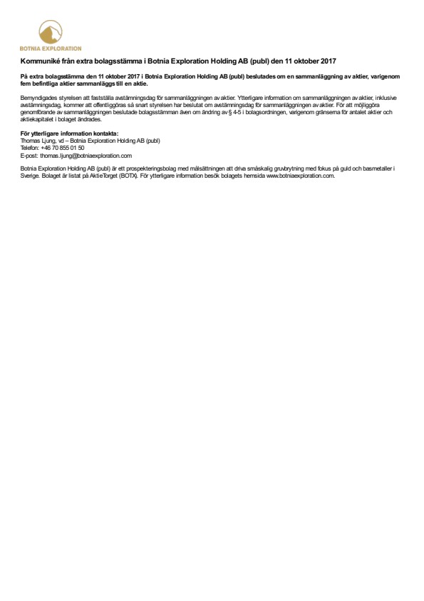 På extra bolagsstämma den 11 oktober 2017 i Botnia Exploration Holding AB (publ) beslutades om en sammanläggning av aktier, varigenom fem befintliga aktier sammanläggs till en aktie.