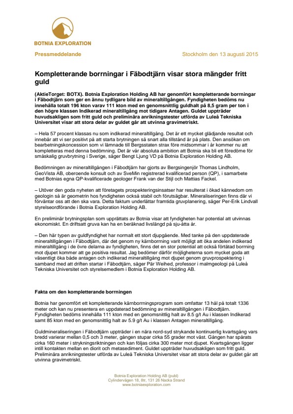 Botnia Exploration Holding AB (publ) är ett prospekteringsbolag med fokus på guld och basmetaller i Sverige. Bolaget är listat på AktieTorget (BOTX). För ytterligare information besök bolagets hemsida www.botniaexploration.com.