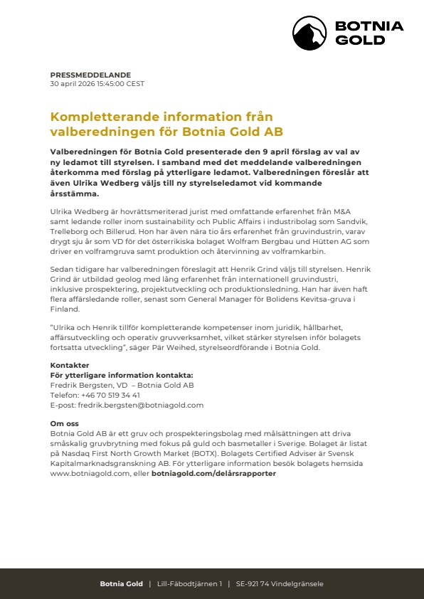 Valberedningen för Botnia Gold presenterade den 9 april förslag av val av ny ledamot till styrelsen. I samband med det meddelande valberedningen återkomma med förslag på ytterligare ledamot. Valberedningen föreslår att även Ulrika Wedberg väljs till ny styrelseledamot vid kommande årsstämma.