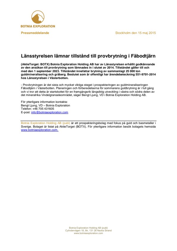 (AktieTorget: BOTX) Botnia Exploration Holding AB har av Länsstyrelsen erhållit godkännande av den ansökan till provbrytning som lämnades in i slutet av 2014. Tillståndet gäller till och med den 1 september 2023. Tillståndet innefattar brytning av sammanlagt 25 000 ton guldmineralisering och gråberg. Beslutet som är offentligt har ärendebeteckning 551-9701-2014 hos Länsstyrelsen i Västerbotten.