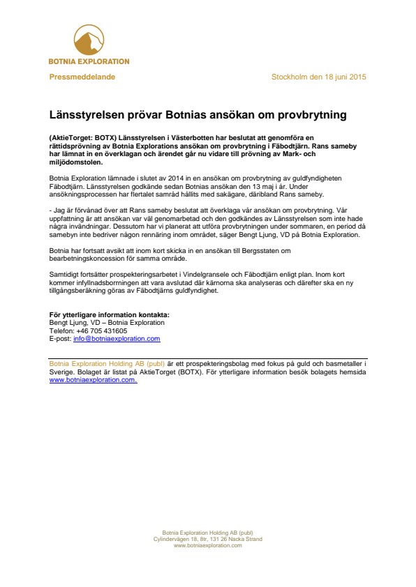 Botnia Exploration Holding AB (publ) är ett prospekteringsbolag med fokus på guld och basmetaller i Sverige. Bolaget är listat på AktieTorget (BOTX). För ytterligare information besök bolagets hemsida www.botniaexploration.com.