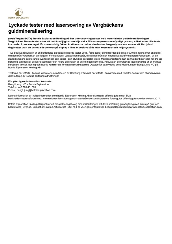– De positiva resultaten är en bekräftelse på tidigare utförda tester 2015. Årets tester genomfördes på cirka 3 000 ton, tagna över ett större område från Vargbäcken än tidigare. Fyndigheten i Vargbäcken består, till skillnad från den höghaltiga guldfyndigheten Fäbodtjärn, av en mängd smalare guldförande kvartsgångar som ligger i den ofyndiga bergarten diorit. Med lasersortering kan denna diorit mer eller mindre tas bort med avsikten att ge lägre kostnader och högre guldhalt in till anrikningen som följd. Resultaten bekräftar att lasersortering är en mycket intressant teknisk lösning och Botnia kommer att fortsätta samarbetet med Outotec för att utveckla detta vidare, säger Bengt Ljung VD på Botnia Exploration Holding AB.
