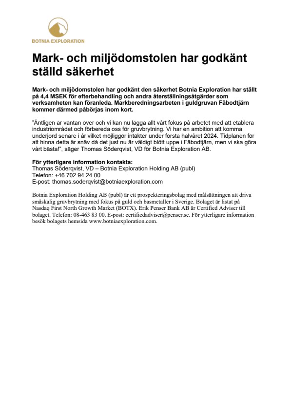 Mark- och miljödomstolen har godkänt den säkerhet Botnia Exploration har ställt på 4,4 MSEK för efterbehandling och andra återställningsåtgärder som verksamheten kan föranleda. Markberedningsarbeten i guldgruvan Fäbodtjärn kommer därmed påbörjas inom kort.