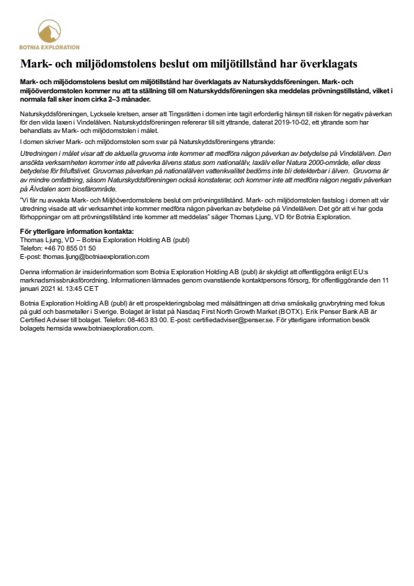 ”Vi får nu avvakta Mark- och Miljööverdomstolens beslut om prövningstillstånd. Mark- och miljödomstolen fastslog i domen att vår utredning visade att vår verksamhet inte kommer medföra någon påverkan av betydelse på Vindelälven. Det gör att vi har goda förhoppningar om att prövningstillstånd inte kommer att meddelas” säger Thomas Ljung, VD för Botnia Exploration.
