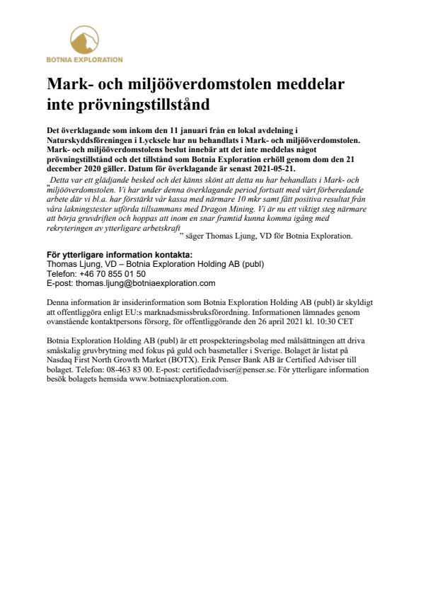 Detta var ett glädjande besked och det känns skönt att detta nu har behandlats i Mark- och miljööverdomstolen. Vi har under denna överklagande period fortsatt med vårt förberedande arbete där vi bl.a. har förstärkt vår kassa med närmare 10 mkr samt fått positiva resultat från våra lakningstester utförda tillsammans med Dragon Mining. Vi är nu ett viktigt steg närmare att börja gruvdriften och hoppas att inom en snar framtid kunna komma igång med rekryteringen av ytterligare arbetskraft säger Thomas Ljung, VD för Botnia Exploration.