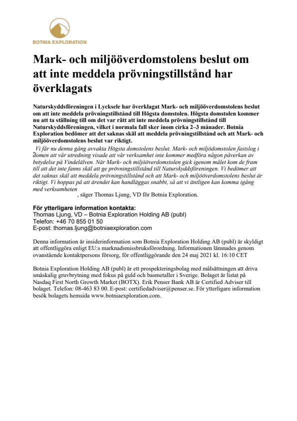 ”Vi får nu denna gång avvakta Högsta domstolens beslut. Mark- och miljödomstolen fastslog i domen att vår utredning visade att vår verksamhet inte kommer medföra någon påverkan av betydelse på Vindelälven. När Mark- och miljööverdomstolen gick igenom målet kom de fram till att det inte fanns skäl att ge prövningstillstånd till Naturskyddsföreningen. Vi bedömer att det saknas skäl att meddela prövningstillstånd och att Mark- och miljööverdomstolens beslut är riktigt. Vi hoppas på att ärendet kan handläggas snabbt, så att vi äntligen kan komma igång med verksamheten, säger Thomas Ljung, VD för Botnia Exploration.