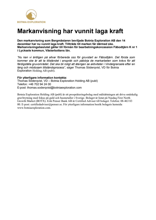 Den markanvisning som Bergmästaren beviljade Botnia Exploration AB den 14 december har nu vunnit laga kraft. Tillträde till marken får därmed ske. Markanvisningsbeslutet gäller till förmån för bearbetningskoncession Fäbodtjärn K nr 1 i Lycksele kommun, Västerbottens län.