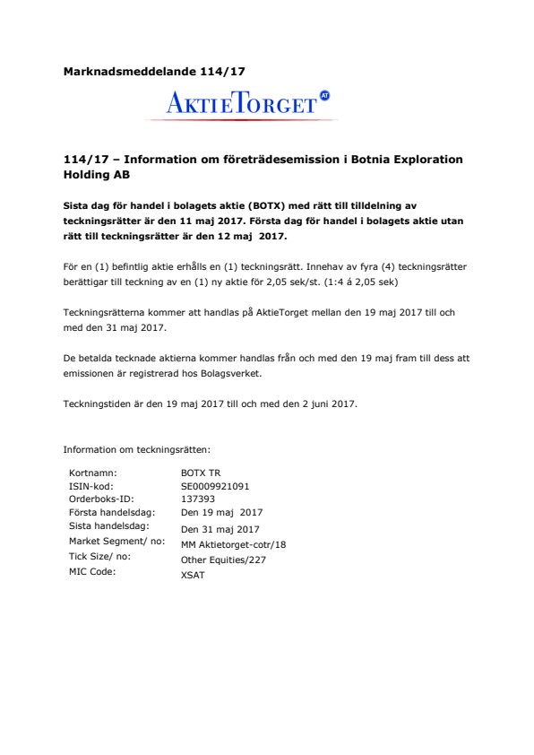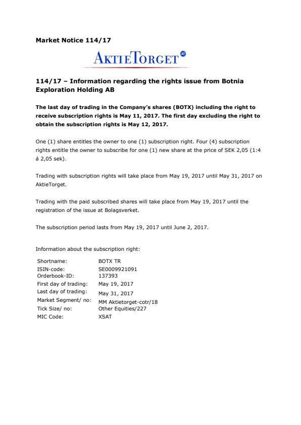 Sista dag för handel i bolagets aktie (BOTX) med rätt till tilldelning av teckningsrätter är den 11 maj 2017. Första dag för handel i bolagets aktie utan rätt till teckningsrätter är den 12 maj 2017.
