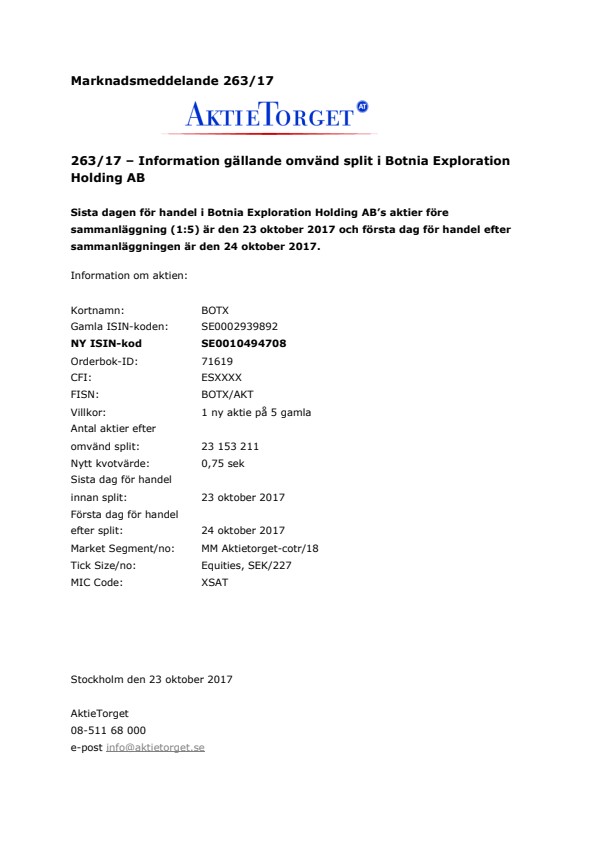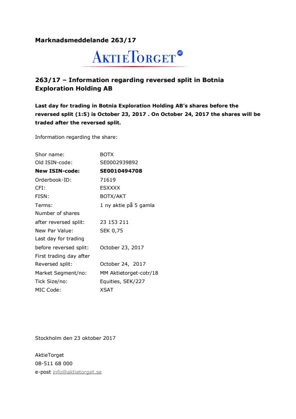 Marknadsmeddelande 263/17 – Information gällande omvänd split i Botnia Exploration Holding AB