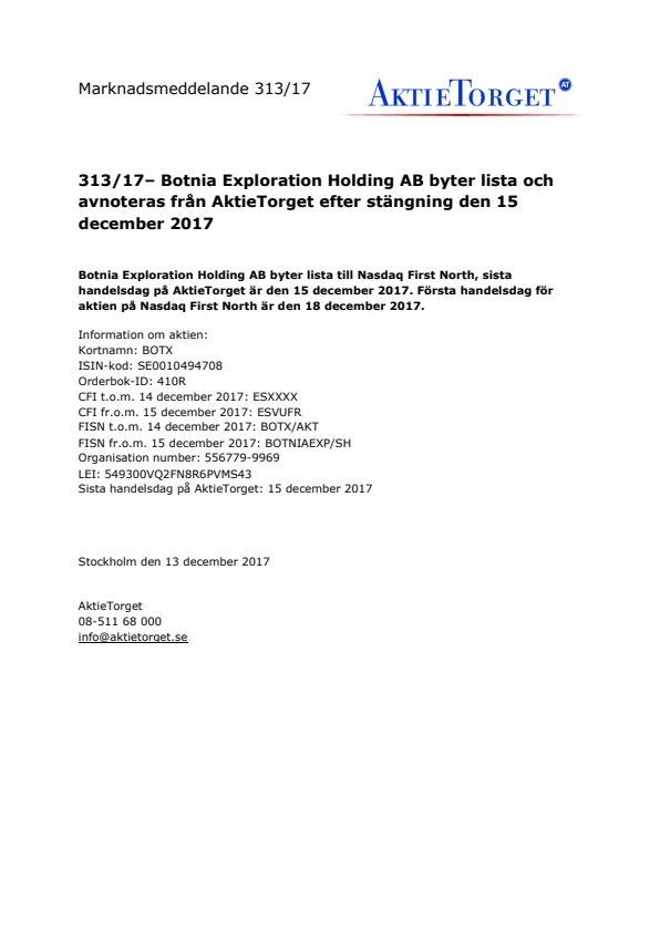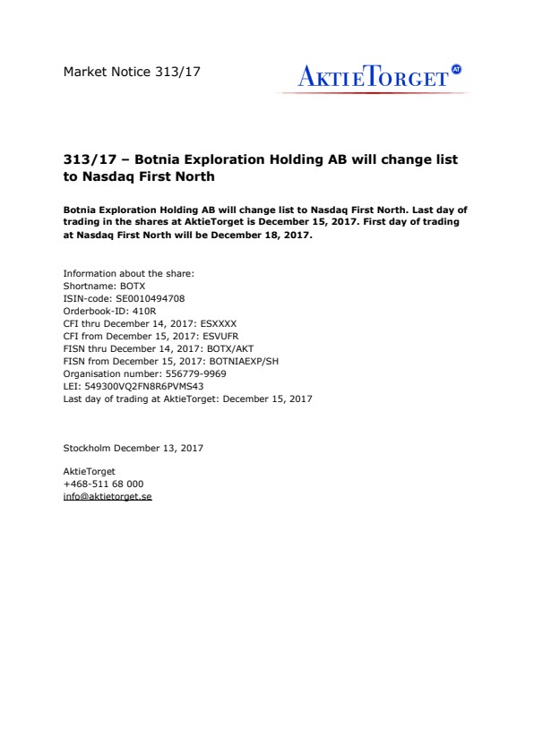 Botnia Exploration Holding AB byter lista till Nasdaq First North, sista handelsdag på AktieTorget är den 15 december 2017. Första handelsdag för aktien på Nasdaq First North är den 18 december 2017.
