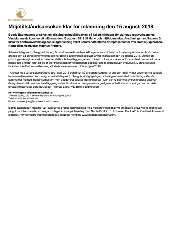 Advokat Magnus Fröberg på Fröberg & Lundholm Advokatbyrå AB agerar som Botnia Explorations juridiska ombud i detta ärende och på deras rekommendation har Botnia Exploration beslutat lämna in ansökan den 15 augusti 2018. Utifrån ett prövningsmässigt perspektiv påverkar detta inte handläggningen av Botnia Explorations ärende. Domstolen kommer att börja handlägga ärendet först då de är åter från semester vilket normalt sett sker under andra halvan av augusti. Denna tidsplan förändrar inte Botnias målsättning att starta verksamheten i Fäbodtjärn 2019.