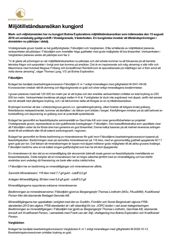 ”Utöver arbetet med miljötillståndsansökan pågår ett intensivt arbete med våra mobiliseringsplaner. Allt för att Botnia Exploration är redo att påbörja produktionen så fort som möjligt efter att ett miljötillstånd har vunnit laga kraft. Guldpriset är nu på vår sida då priset är cirka 473 000 kr per kilo jämfört med cirka 364 000 kr per kilo då vi publicerade vår lönsamhetsstudie i juni 2018. Det priset får gärna hålla i sig”, avslutar Thomas Ljung, VD på Botnia Exploration.