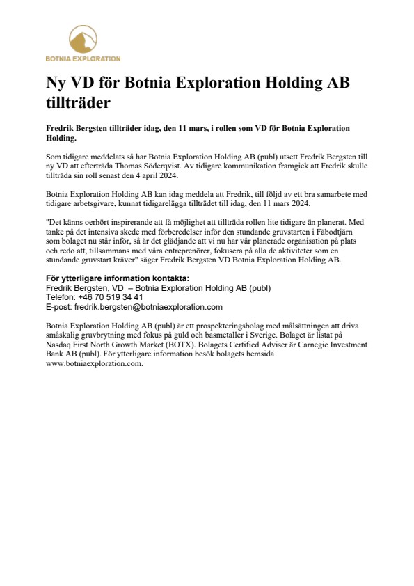 Som tidigare meddelats så har Botnia Exploration Holding AB (publ) utsett Fredrik Bergsten till ny VD att efterträda Thomas Söderqvist. Av tidigare kommunikation framgick att Fredrik skulle tillträda sin roll senast den 4 april 2024.